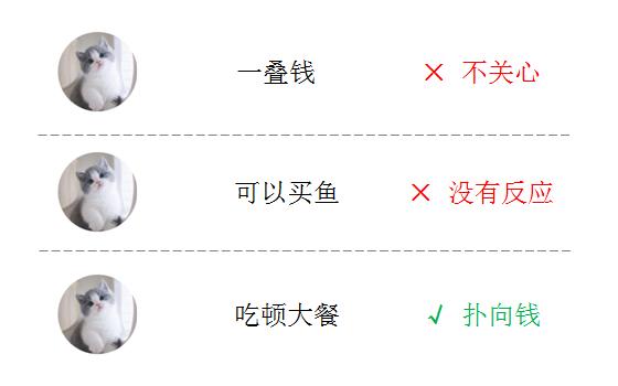 最后,第三个销售员说,买来以后你就可以大吃一顿了,这个就是这叠钱的一个好处,或者说对猫的利益;